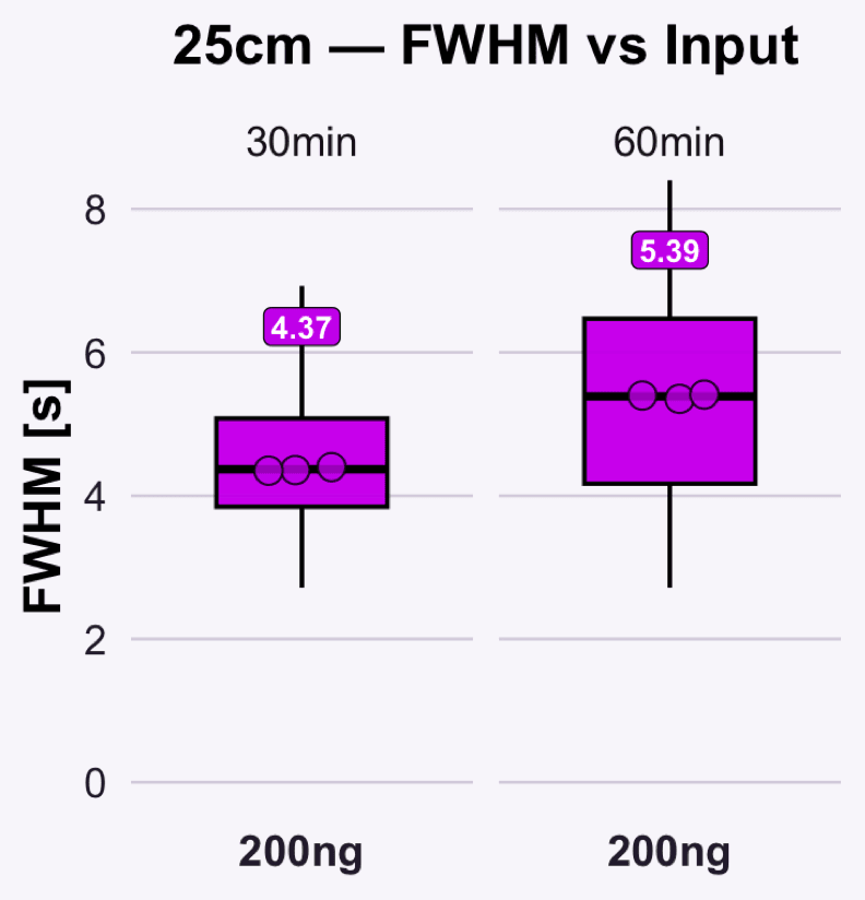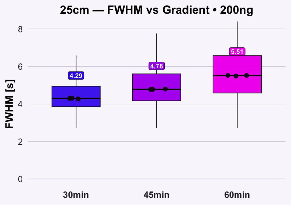 At 400 nL/min, FWHM values of ~4.2–5.5 s across 30–60 min gradients provide the resolving power required for deeper identification and improved precursor separation. The increased column length enhances proteome depth without requiring extreme gradient durations.