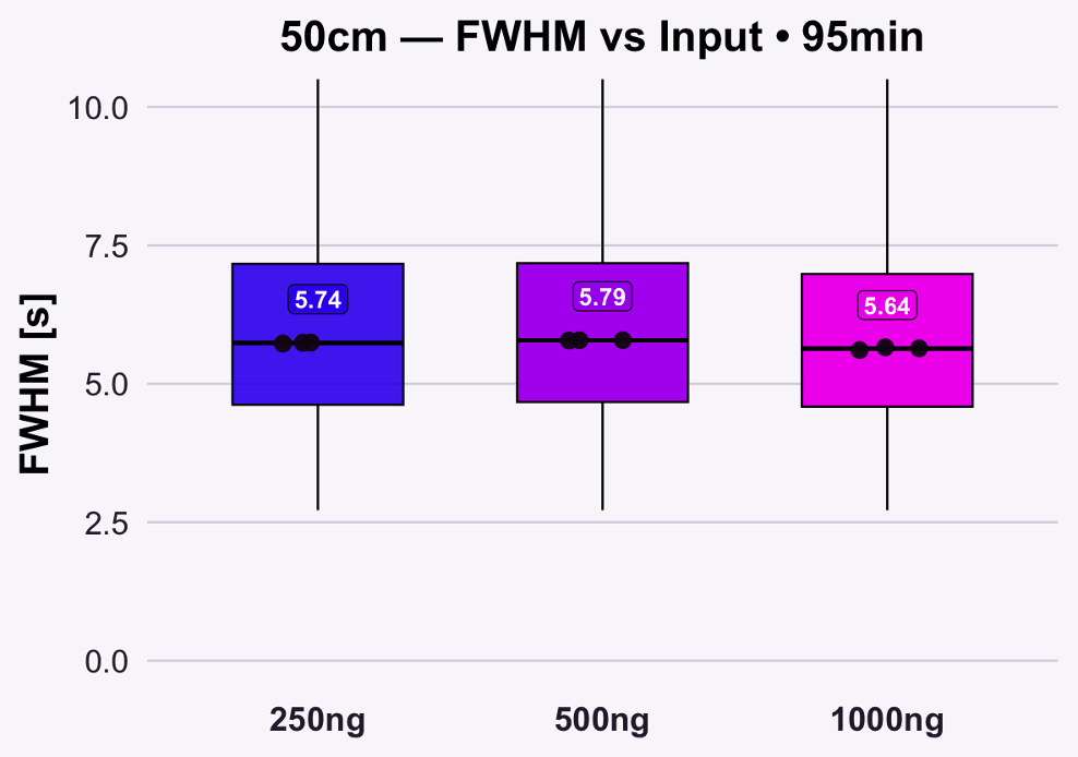 Measured at 250 nL/min, the column achieves ~5.7 s FWHM over ~95 min gradients, offering the separation space necessary to distinguish low-abundance and closely eluting peptides. This is particularly impactful for PTM mapping, deep clinical proteomics, and complex structural studies.